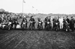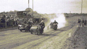 I den store sidevognsklasse var der tæt kamp mellem topparrene. Her ses den senere sølvmedaljetager, Svend Knudsen, Odense forrest. Bagved t.v. mesteren, David Axelsson, København og til højre Nimbus’ fabrikskører, Josef Koch, København.